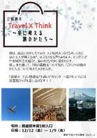 【本館】企画展示「Travel × Think ~冬に考える旅のかたち~」 投稿日時 : 13:49 図書館管理者 旅は、出会いのかたちであり、人と場所をつなぐものです。 しかし、訪れる人が増えるほど、見えなくなる声もあります。インバウンドや地域共生を知ると、旅の見方が少し変わります。 展示本を通して、「旅の裏側」について知り、「これからの旅のかたち」について考えてみませんか。 「読後カード」に感想などを書いてカウンターへ提出した方には図書館グッズを差し上げます!! 場所:本館1階展示コーナー期間:12/12(金)~1/9(金) タグ 本館 企画展示