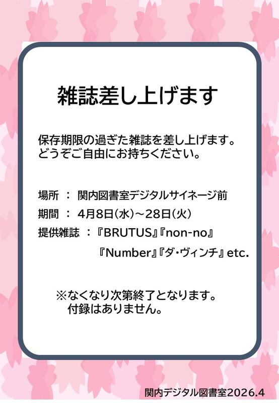 【関内】雑誌のバックナンバー配布します!! 投稿日時 : 12:00 図書館管理者 カテゴリ:NEW 関内デジタル図書室にて、保存期限が過ぎた雑誌のバックナンバーをさしあげます。お気軽に立ち寄り、ご自由にお持ちください。なくなり次第終了となりますのでご了承ください。 【提供期間】2026年4月8日(水)~4月28日(火)【提供場所】関内デジタル図書室 デジタルサイネージ前【提供雑誌】BRUTUS・non-no・Number・ダ・ヴィンチなど タグ 関内デジタル図書室 雑誌配布