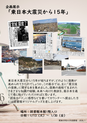 東日本大震災から15年が経ちますが、どのように復興が進められてきたのでしょうか。この展示では、主に「震災後の復興」に関する本を集めました。復興の過程で生まれたさまざまな知識や経験、未来へ向けた教訓を、展示本を通じて感じ取っていただければと思います。